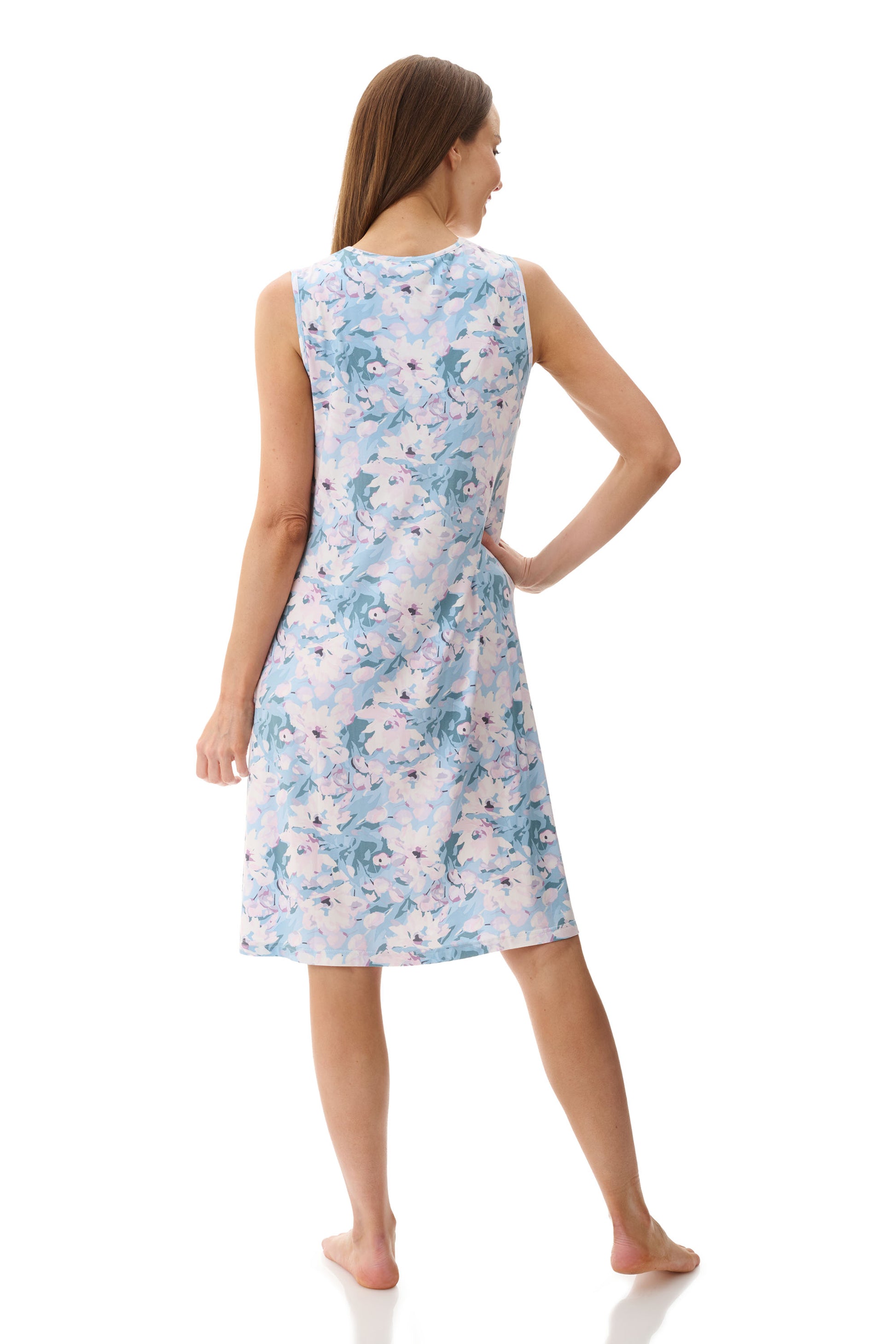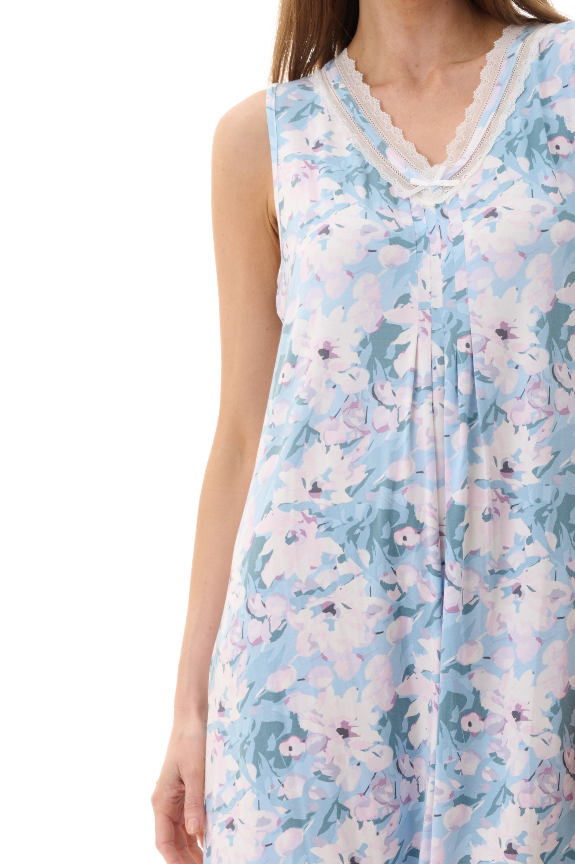 Introducing Amelia, a watercolour floral print on a lovely Mint colourway. This sleeveless short nightie is adorned with a delicate lace neckline, while front pleats and a floaty fit add an extra layer of charm. Crafted from buttery-soft modal, luxurious comfort and dreamy nights await.