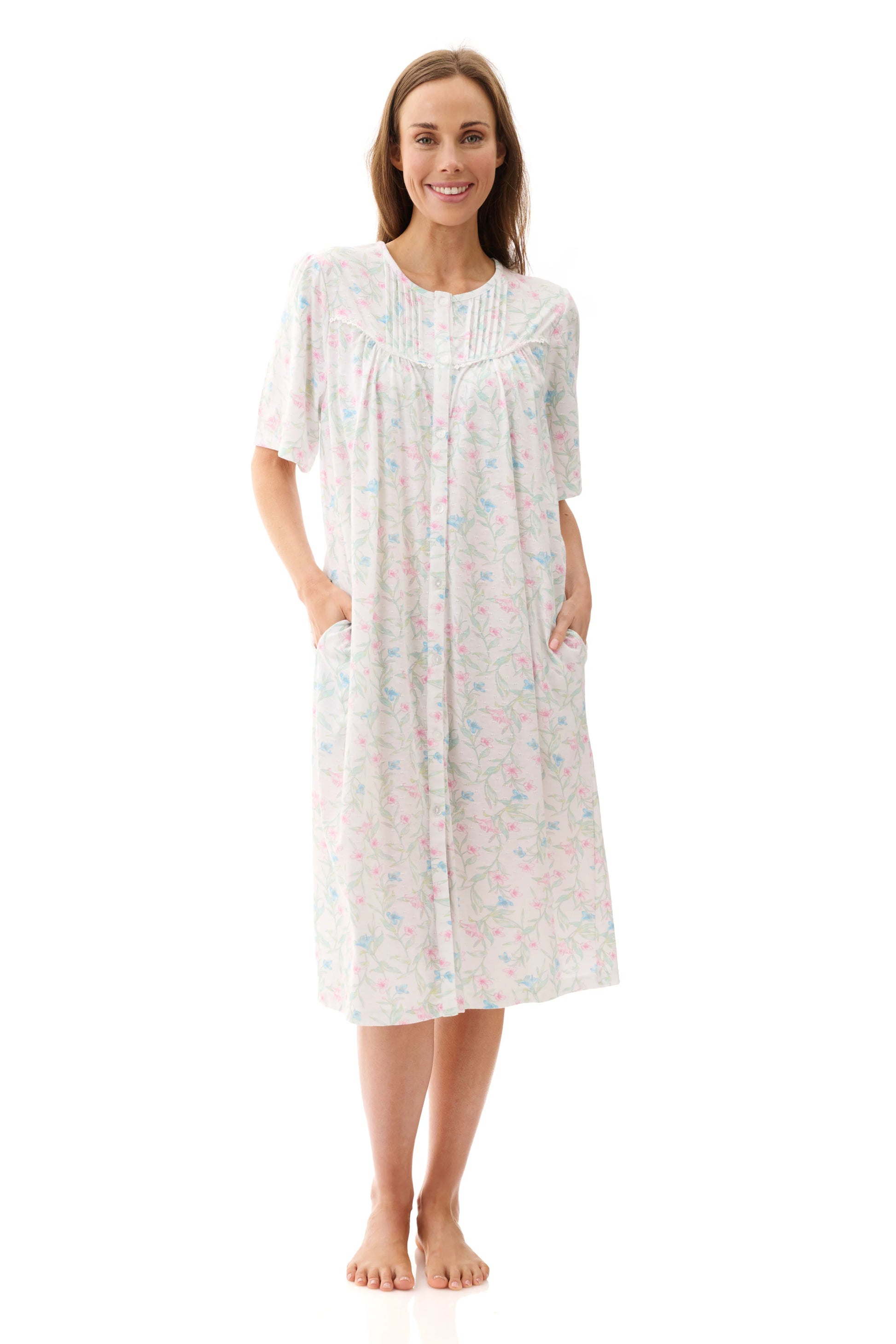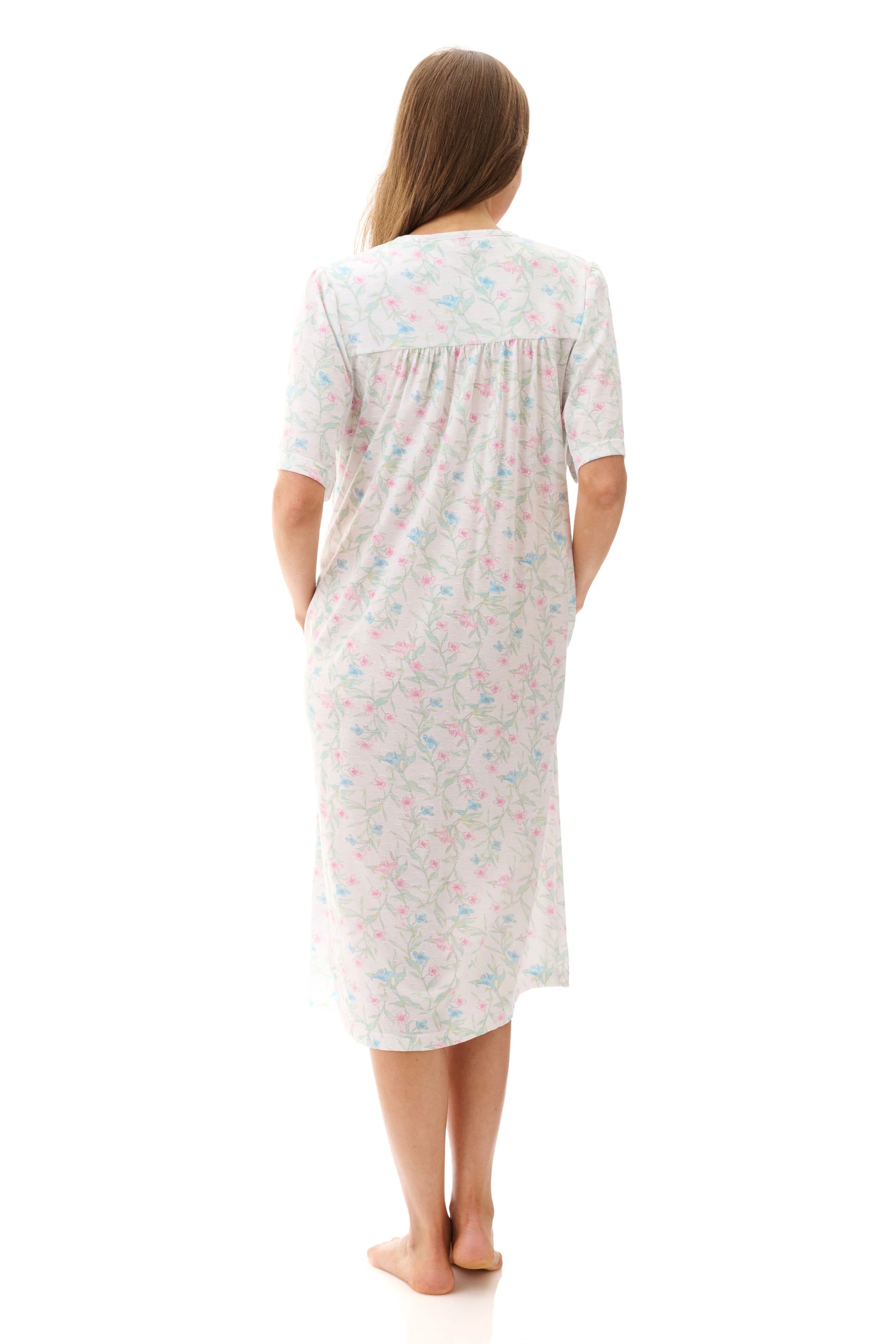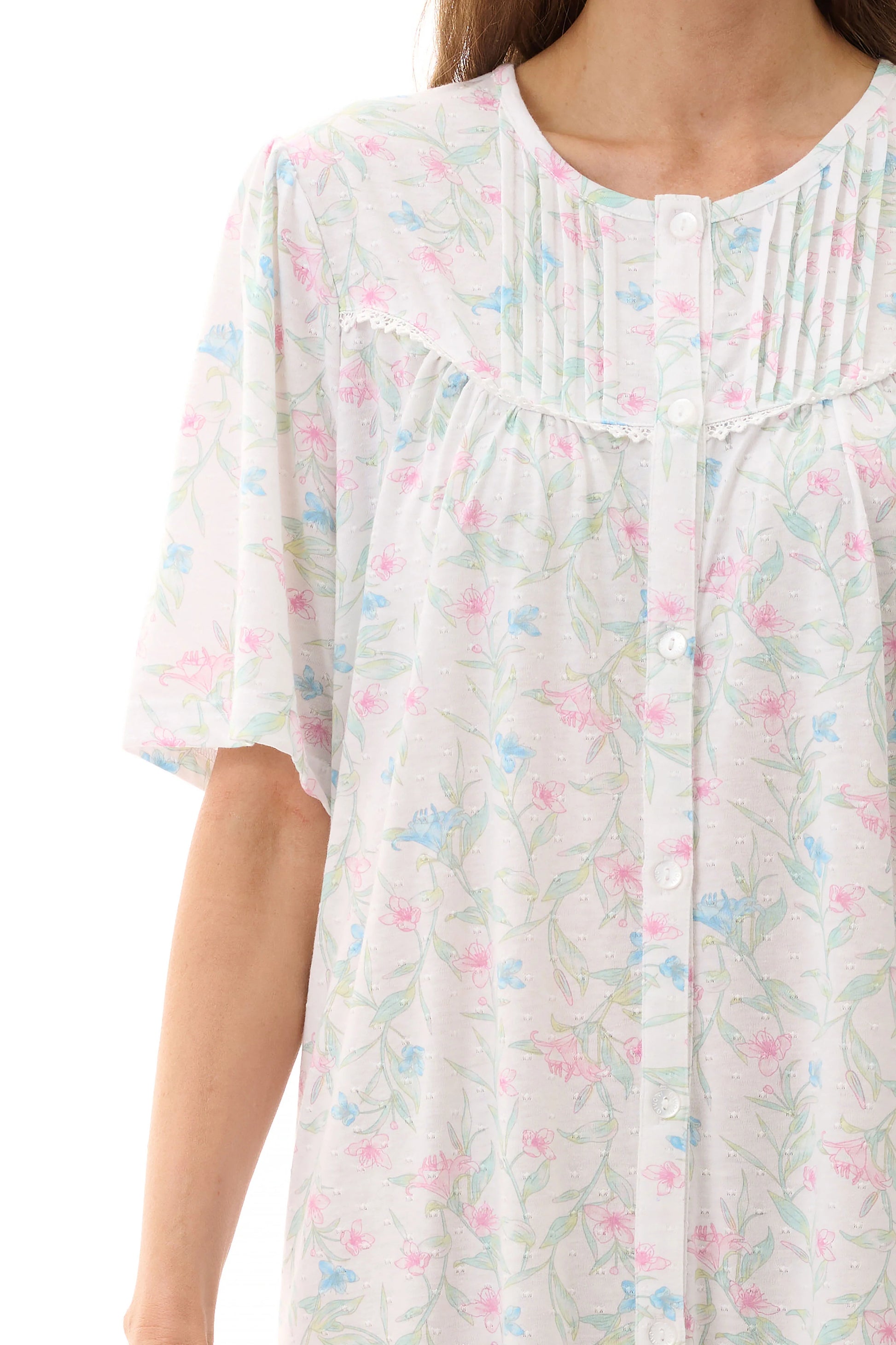 Short sleeve brunchcoat in a fresh garden floral on jacquard knit jersey. Easy wear and care. A curve yoke with pretty pintucks either side of a full front button opening. Front and back yokes with soft gathers.