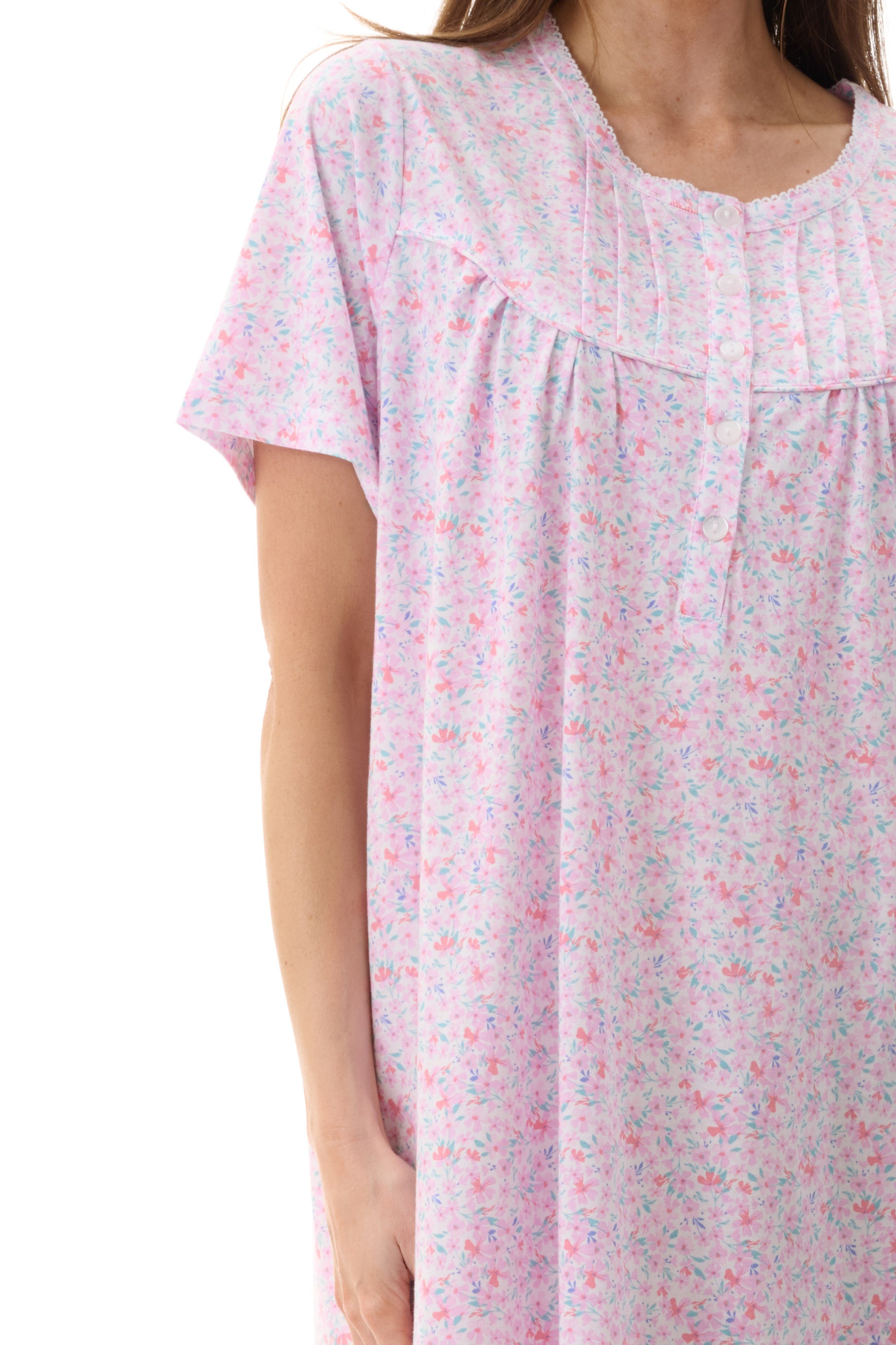 Connie short sleeve short nightie in a summery and fresh pink floral print is an easy wear and care garment. Curved yoke with soft pintuck detail. Self band on the neckline with picoette stitch detail. Soft gathers at the front and back yokes.