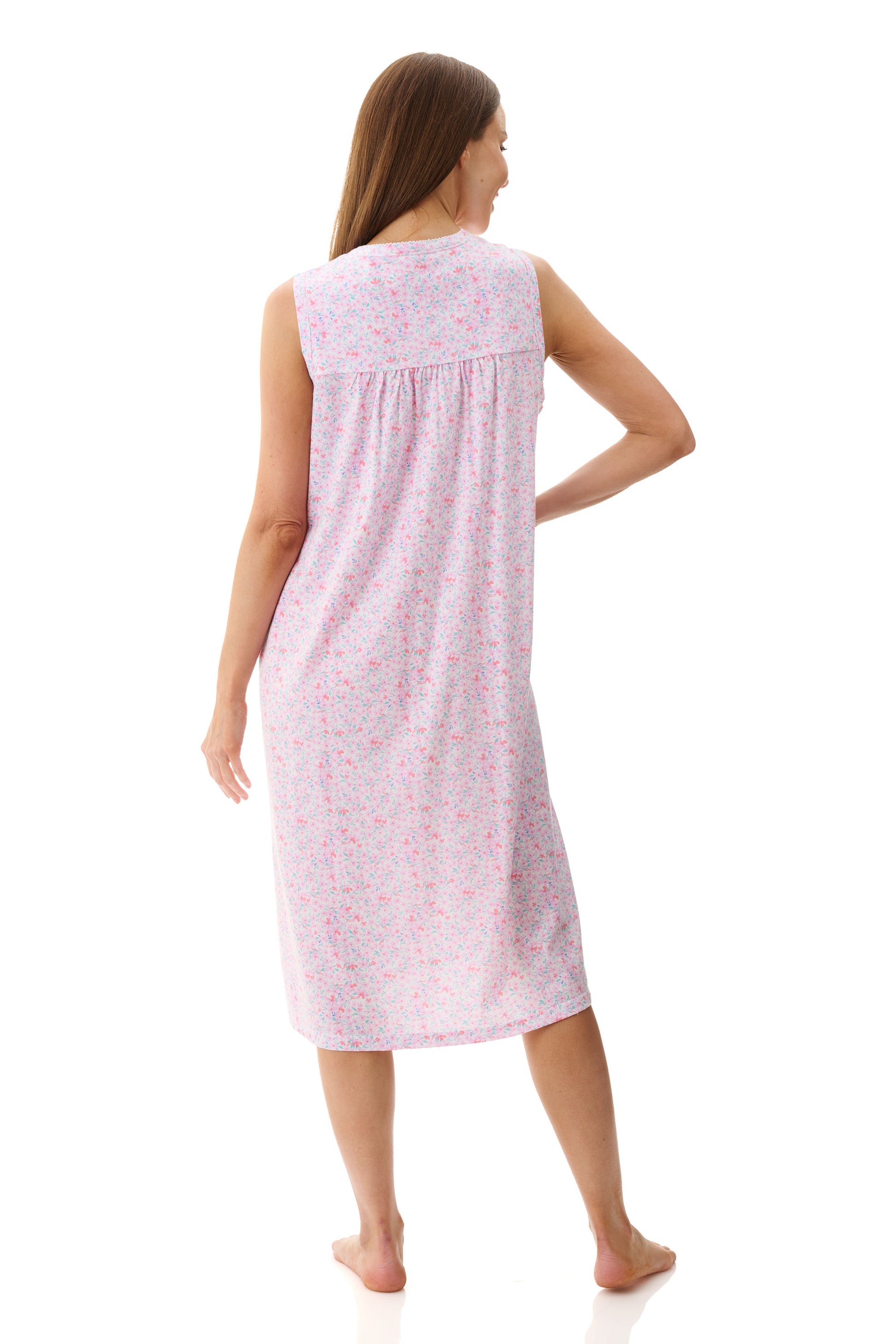 Connie sleeveless short nightie in a summery and fresh pink floral print is an easy wear and care garment. Curved yoke with soft pintuck detail. Self band on the neckline and armholes. Front button placket opening. Soft gathers at the front and back yokes. Add the matching brunchcoat to create a fresh, relaxing summer set.