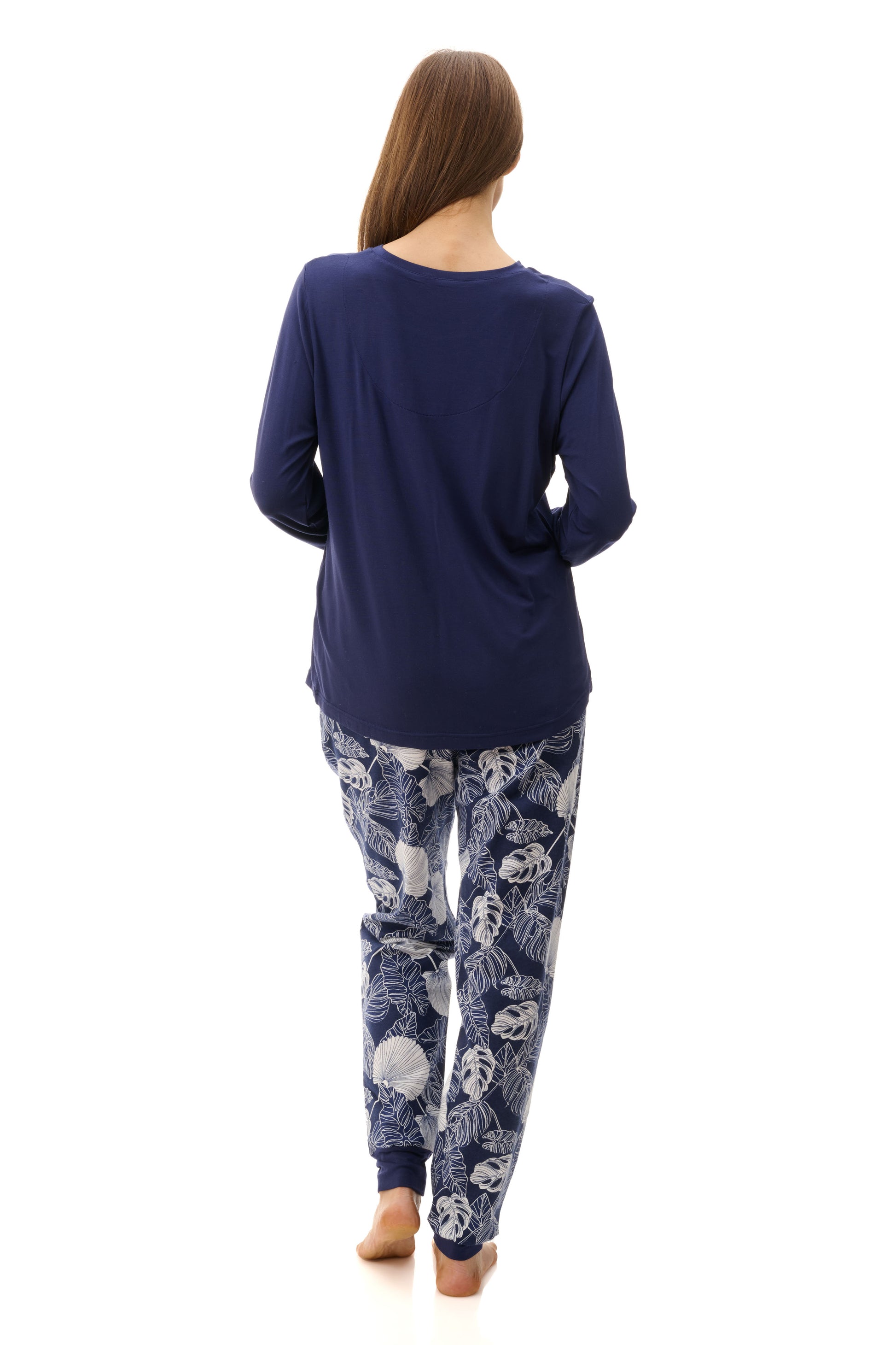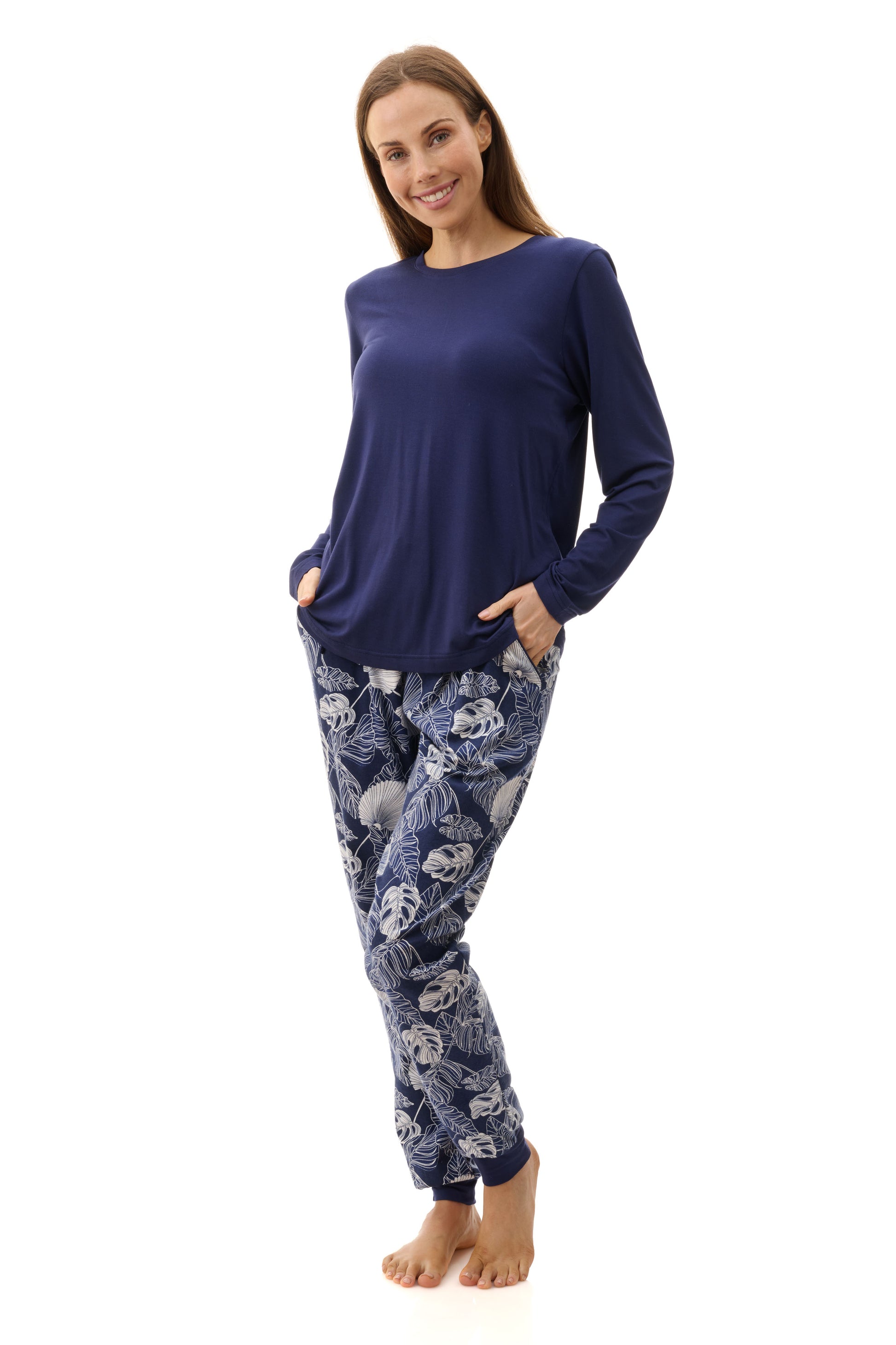 Drew Long ski pyjama in a modern Navy coloured print on flannelette, warm and cosy for colder winter nights. Print pants with moss marle knit waistband, drawstring and cuffs. Moss marle round neck long sleeve top in slinky knit