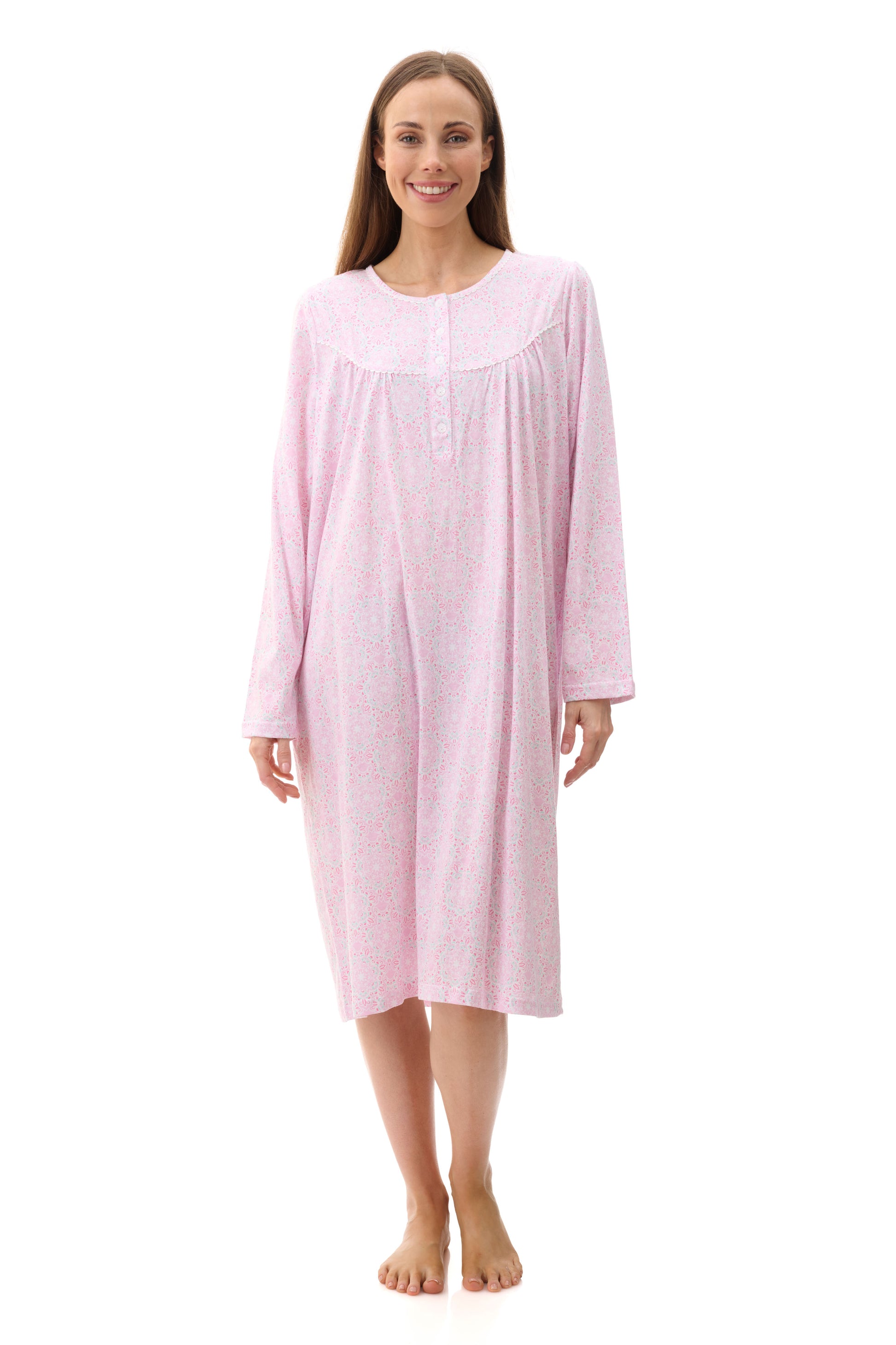Short length nightie in a multi coloured floral print on soft and comfortable knit jersey. Nightie has long sleeves, a round neck with picoette scallop stitch. Self piping under the neck bind and across the curved yoke. Soft gathers fall from the yoke to the front skirt. A placket front opening with buttons.