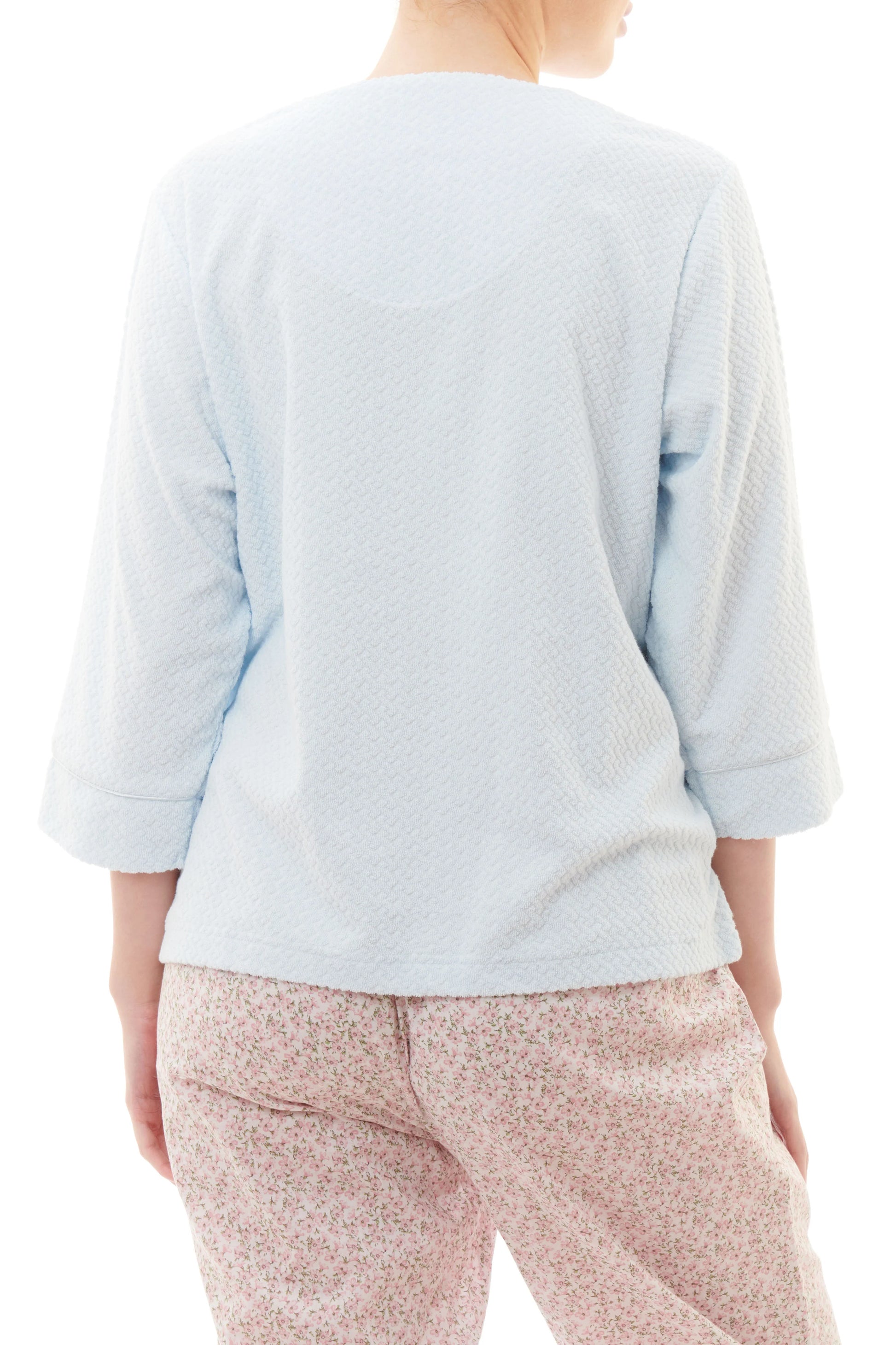 Wrap yourself in pure luxury with this self jacquard knit towelling bed jacket. With a button front with yoke and gathers, this effortless design is the perfect summer weight. Pretty satin piping trim and side inset pockets. Available in Sky and Pink.