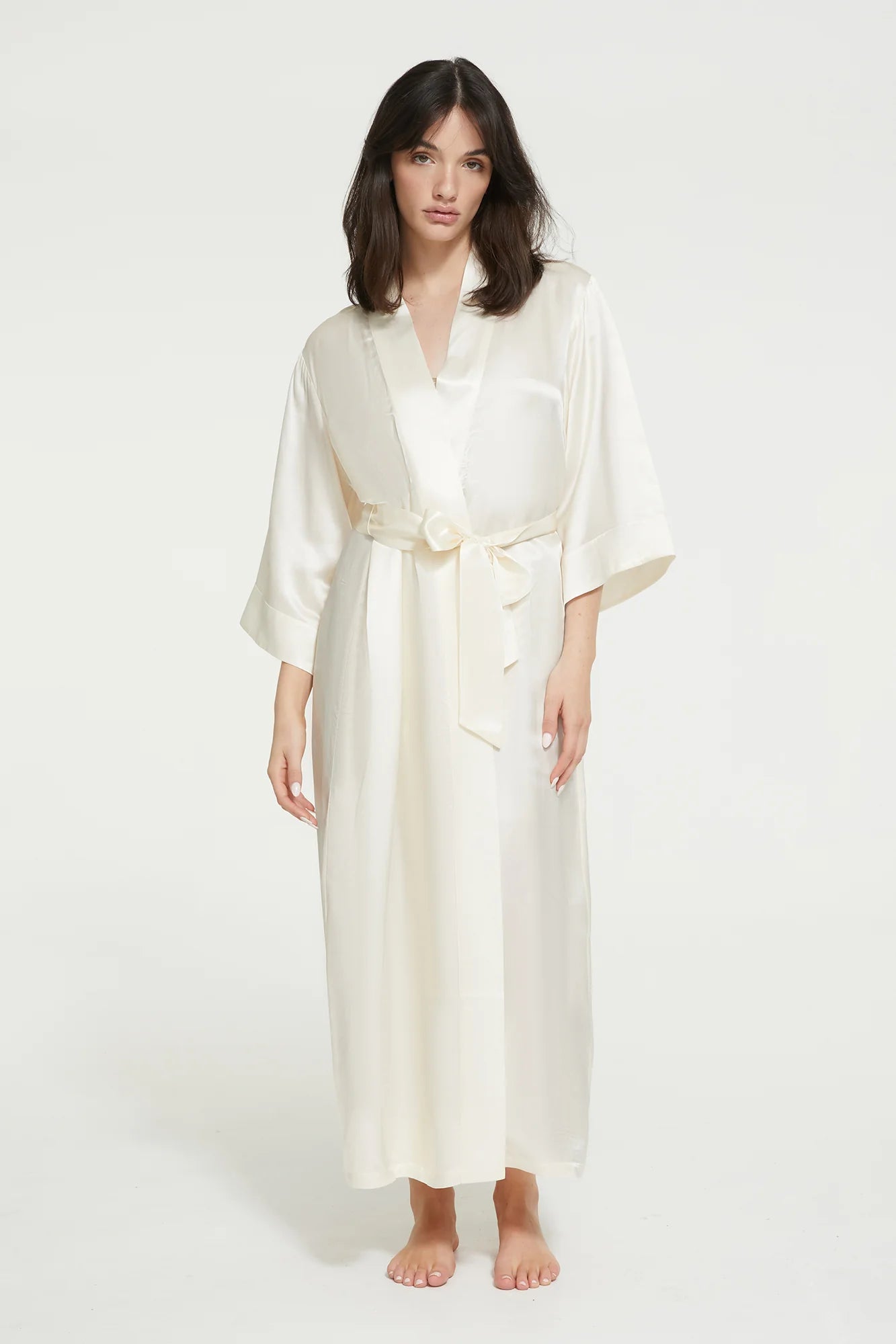 Mrs Long Robe is an enduring romance, made from soft silk and viscose to celebrate the female form. A cover-up robe that falls to the mid-calf. The neckline is finished with a shawl collar. Silk ribbon inserts to secure the robe on the inside and a silk belt to secure around the waist.