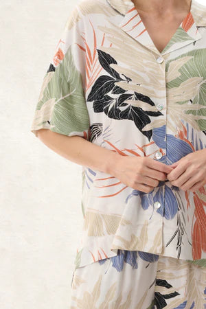 Indulge in ultimate comfort with our relaxed-fit, short pyjama set in soft woven twill, adorned with a striking hand-illustrated tropical leaf print. Featuring shorts and top with drop sleeves, the soft woven twill fabric ensures a relaxed and unrestricted fit, for a tranquil night's sleep. The eye-catching tropical leaf print adds a touch of tropical charm, combining comfort and style seamlessly.Â