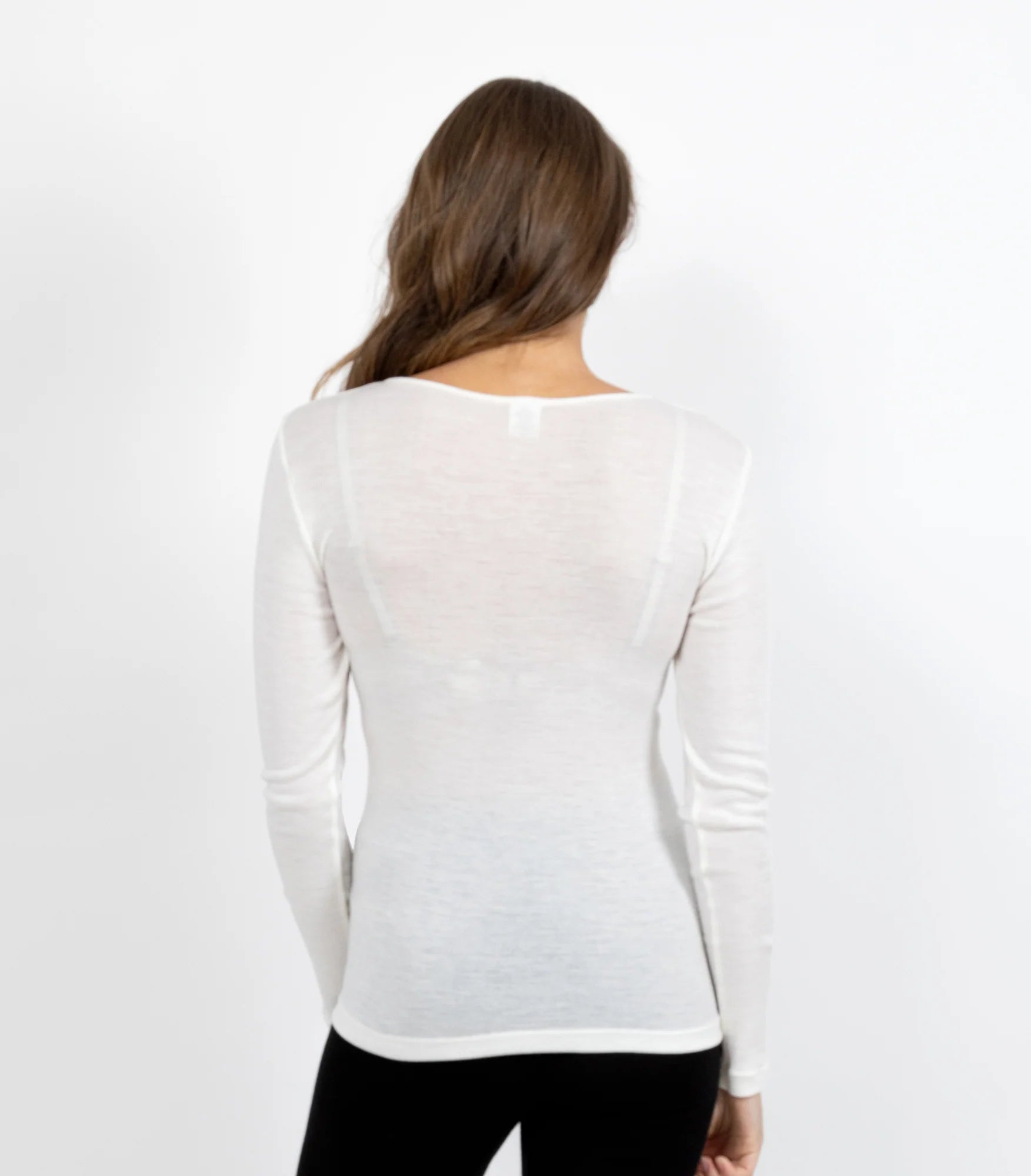 Superbly warm Merino wool long sleeve thermal top. Side seam free, trimmed with luxurious Guippure motif.