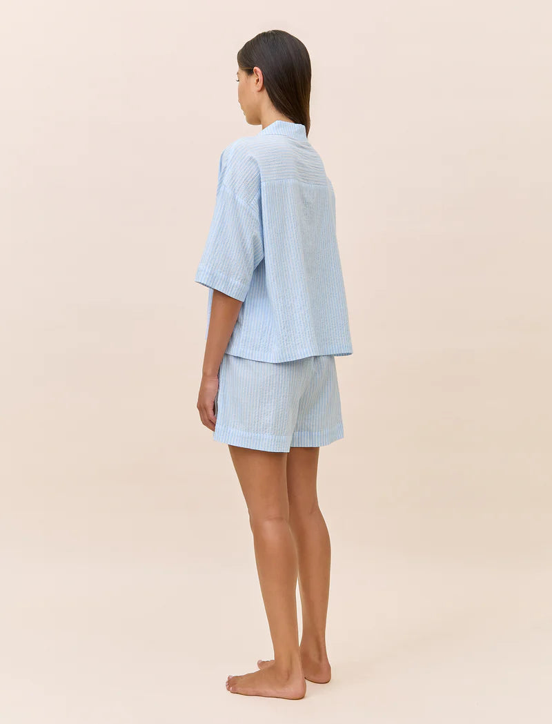 - Top: Oversized, boxy fit, with a slightly cropped body. Button-up front with notch collar
